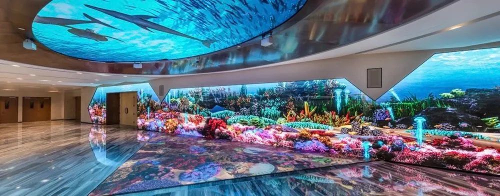 宴会厅前厅:配备了房顶、墙壁和地面融合组成的巨型交互式屏幕。使用xcsport体育VED系列P2.5LED小间距屏幕,不仅能完美地呈现各种特效,还可结合虚拟现实技术来使用。