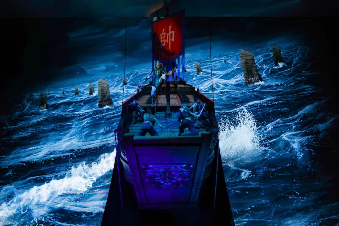 演出首先在视效上完成一个壮举:五个演出空间中,共计铺设了总面积达3000平方米的LED屏幕,相当于半个专业足球场的大小,其中还包括技术较复杂的大面积曲面LED屏幕。这样的大胆应用在沉浸式演出中实属罕见。为最大程度创造质感,创意团队制作了城墙、街道、桥梁、山体、亭台、牌坊、战船,屏幕画面与大量实景结合,完成了对以往沉浸式演艺“全部实景化”或“全部屏幕化”在表达效果上的突破。